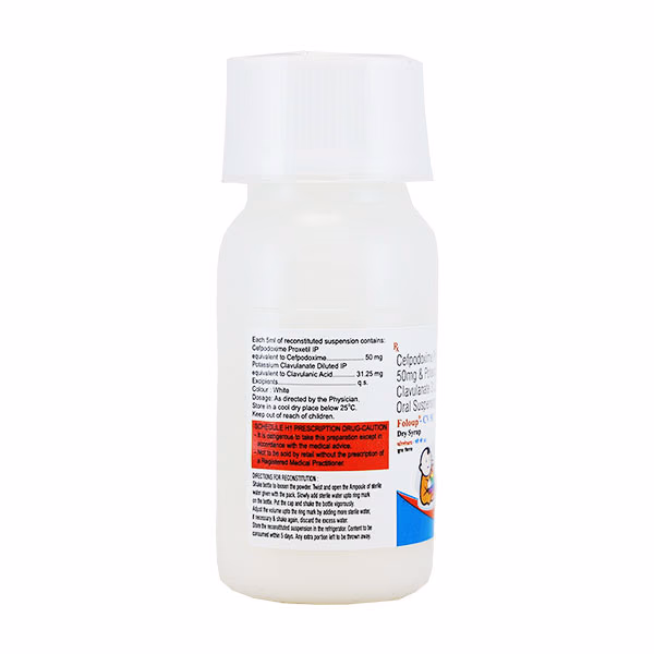 Foloup CV 50mg/31.25mg Dry Syrup is a potent pediatric antibiotic designed to combat a wide range of bacterial infections in children. Combining Cefpodoxime Proxetil and Clavulanic Acid, this medicine targets infections affecting the ear, throat, lungs, skin, and urinary tract by stopping bacterial growth and enhancing antibacterial effectiveness.