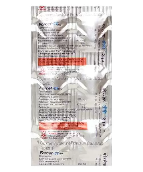 Keywords: Forcef-CV 250 Tablet, Forcef-CV antibiotic, Cefuroxime Clavulanic Acid tablet, bacterial infection treatment, respiratory infection antibiotic, urinary tract infection antibiotic, skin infection antibiotic