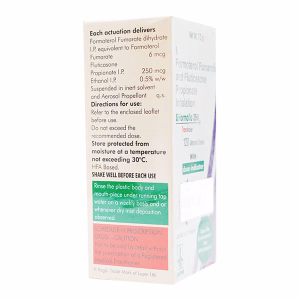 Formoflo 250 Transhaler is a dual-action inhaler designed to improve breathing in patients with asthma and chronic obstructive pulmonary disease (COPD). By relaxing airway muscles and reducing inflammation, it eases airflow and helps manage respiratory symptoms.
