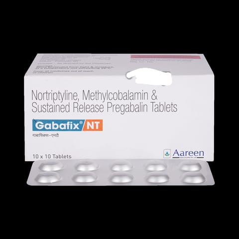 Gabafix NT 75mg/10mg/1500mcg Tablet, Gabafix NT Tablet for Neuropathic Pain, Gabafix NT Pregabalin Nortriptyline Methylcobalamin Tablet, Gabafix NT Nerve Pain Relief Medicine.