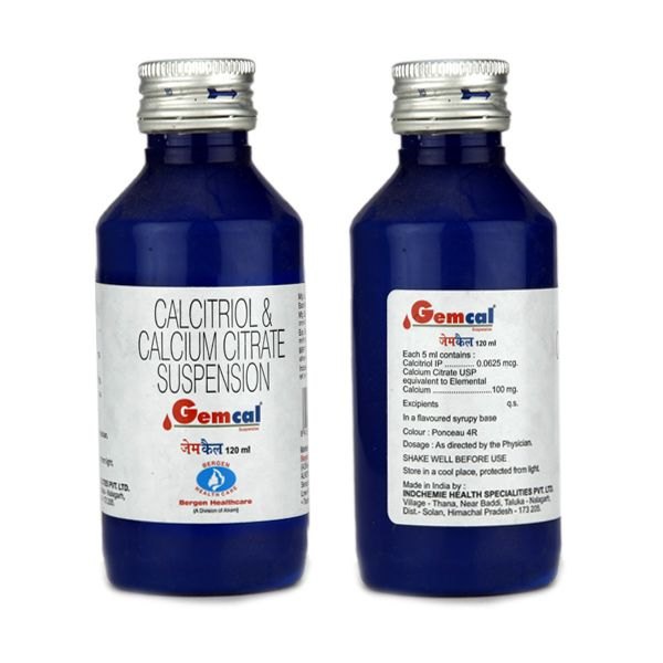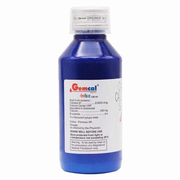 Gemcal Suspension is a dietary supplement formulated to correct calcium and vitamin D deficiencies. It works by enhancing the body’s ability to absorb calcium and directly providing the necessary minerals to maintain proper bone health and muscle function. This suspension plays a key role in preserving bone strength, regulating muscle activity, and maintaining optimal calcium balance throughout the body. It should be taken exactly as prescribed by your healthcare provider. Consistent daily use at the same time improves effectiveness and helps maintain stable nutrient levels. For best results, it is recommended to follow a balanced diet that includes protein, leafy vegetables, and dairy products, along with engaging in regular weight-bearing exercises to promote healthy bone density. While this product is generally well tolerated, there is limited data on side effects. In rare cases, users might experience discomfort or adverse reactions; if symptoms persist or worsen, it is important to consult a doctor. Before starting Gemcal Suspension, disclose any history of kidney stones, high calcium levels, or existing kidney problems, as supplementation may worsen these conditions. Avoid taking additional calcium or vitamin D products unless specifically advised by your doctor to prevent over-supplementation. Pregnant and breastfeeding women should only use this supplement under medical supervision. Gemcal Suspension is primarily used to address nutritional deficiencies, especially in individuals with inadequate dietary intake or increased nutritional demands. By replenishing calcium levels, it helps prevent issues like muscle cramps, brittle bones, and bone fragility. Its formulation combines calcium and calcitriol — the active form of vitamin D — to support improved calcium absorption and regulate calcium-phosphate levels in the body. Together, they help maintain strong bones, support neuromuscular function, and ensure calcium-dependent processes run smoothly. In case a dose is missed, it should be taken as soon as remembered. If it’s almost time for the next dose, skip the missed one and resume the usual schedule — do not double the dose. Always shake the bottle well before use and measure with the provided cup. Though the safety profile is favorable, consult your doctor if you have underlying conditions or are on other medications.