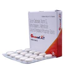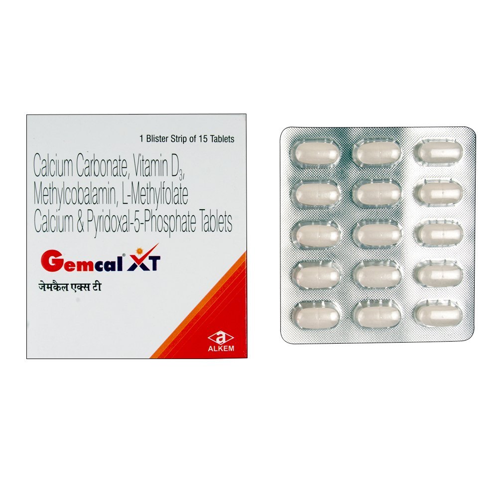 Gemcal XT Tablet contains a combination of calcium carbonate, vitamin D3, methylcobalamin, L-methyl folate calcium, and pyridoxal-5-phosphate. Calcium carbonate supplements calcium intake when dietary sources are insufficient. Vitamin D3 enhances calcium absorption and increases blood calcium levels. Methylcobalamin, a form of vitamin B12, helps treat anemia and nerve disorders by restoring vitamin B12 levels. L-methyl folate calcium and pyridoxal-5-phosphate provide essential nutrients that support overall health and metabolic functions.