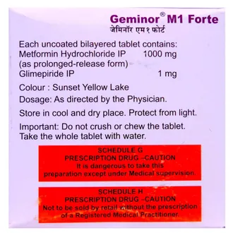 Geminor M1 Forte Tablet PR is a prescription medication specially formulated for patients with type 2 diabetes mellitus who require enhanced glycemic control along with blood pressure management. It is a combination therapy containing Metformin, which reduces liver glucose production and improves insulin sensitivity, and Amlodipine, a calcium channel blocker that helps manage hypertension. The prolonged-release (PR) formulation ensures a steady release of active ingredients, providing consistent control of blood sugar and blood pressure throughout the day. This tablet is particularly suitable for patients who need a higher strength dose due to inadequate control with standard combination therapy. Regular use along with diet, exercise, and lifestyle modifications helps reduce the risk of cardiovascular complications, maintain metabolic health, and improve overall well-being.