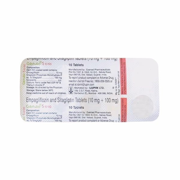 Gibtulio-S 10/100 Tablet is a prescription medicine used in the management of type 2 diabetes mellitus. It combines two active ingredients that work together to regulate blood sugar. One component helps the kidneys remove extra glucose through urine, while the other improves the body’s sensitivity to insulin and decreases sugar production in the liver. This combined effect helps in achieving better control of blood glucose levels when diet and exercise alone are not sufficient.
