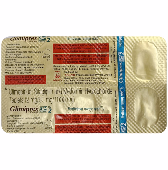 Glimiprex SM Forte 2 Tablet combines three medicines to effectively control blood sugar. Sitagliptin increases incretin levels, which stimulate insulin release and reduce sugar production by the liver. Glimepiride helps the pancreas produce more insulin and improves its efficiency in lowering blood glucose. Metformin reduces glucose absorption from food, decreases glucose production in the liver, and enhances the body’s response to insulin.
