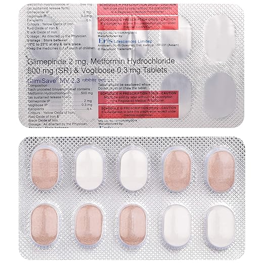 Glimisave MV 2.3 Tablet SR is a combination medicine prescribed for the management of type 2 diabetes mellitus. It helps in keeping blood sugar levels under control by targeting different mechanisms—stimulating insulin secretion, lowering sugar production in the liver, improving insulin action, and slowing down the absorption of carbohydrates from food.