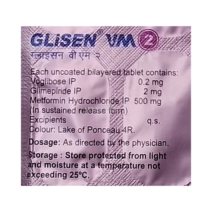 Glisen VM 2 Tablet SR is a prescription medication designed to help adults manage type 2 diabetes mellitus. When used alongside a balanced diet and regular exercise, it helps maintain healthy blood sugar levels and reduces the risk of diabetes-related complications such as kidney damage, nerve problems, eye disorders, and cardiovascular issues.