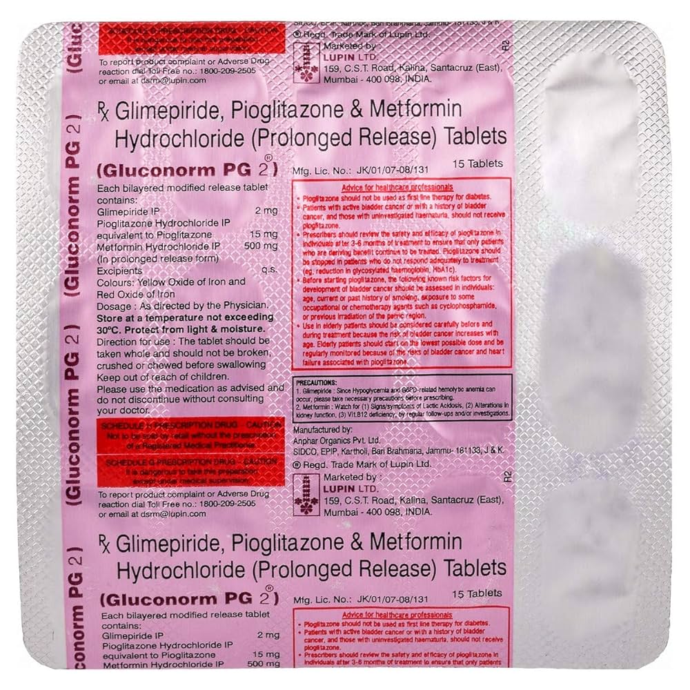 Gluconorm PG 2 Tablet PR is an advanced antidiabetic medication designed for adults with type 2 diabetes mellitus. When combined with a balanced diet and regular exercise, it helps maintain healthy blood sugar levels by enhancing insulin effectiveness and regulating glucose metabolism.