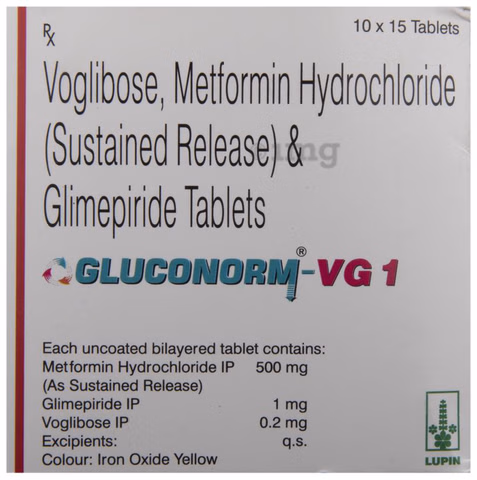 Gluconorm-VG 1 Tablet SR is a potent anti-diabetic medication designed for adults with type 2 diabetes mellitus. It combines three active ingredients—glimepiride, metformin, and voglibose—to effectively manage blood sugar levels and reduce the risk of diabetes-related complications such as kidney damage, nerve disorders, and eye problems.