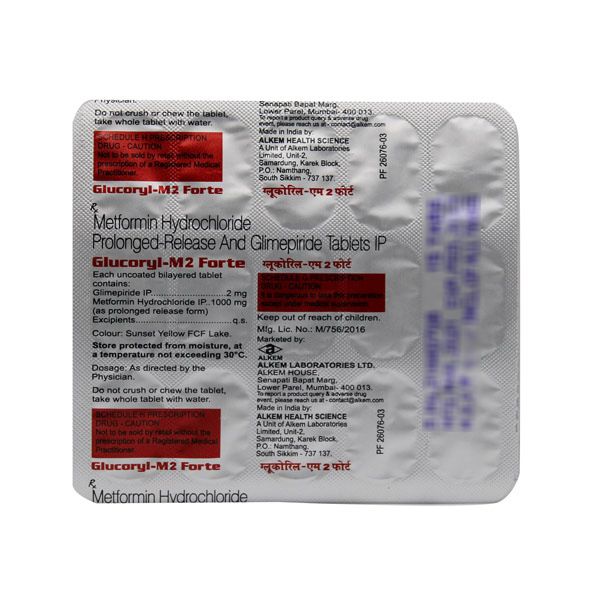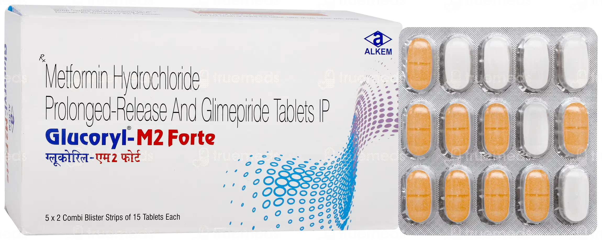 Glucoryl-M 2 Forte Tablet PR is an oral medication used to treat type 2 diabetes mellitus in adults. It combines two active ingredients that help manage blood sugar levels effectively. This medicine is best taken with food, once daily, at the same time each day to ensure consistent blood sugar control. Your healthcare provider will determine the right dosage for you, which may be adjusted depending on your response and blood sugar readings. It is important to continue taking this medication even if you feel well, as stopping it without medical advice may cause blood sugar levels to rise, increasing the risk of serious complications like kidney damage, vision loss, nerve damage, or limb problems. Proper management of diabetes also involves following a healthy diet, exercising regularly, and maintaining a suitable weight as directed by your doctor.