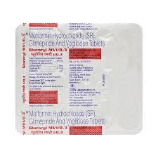 Glucoryl MV1/0.3 Tablet SR combines three antidiabetic agents: glimepiride, metformin, and voglibose, which work together to improve blood sugar control. Glimepiride stimulates insulin secretion from the pancreas. Metformin reduces glucose production by the liver, delays absorption of sugar from the gut, and increases the body’s sensitivity to insulin. Voglibose inhibits enzymes that break down complex sugars, preventing sharp increases in blood sugar after eating.