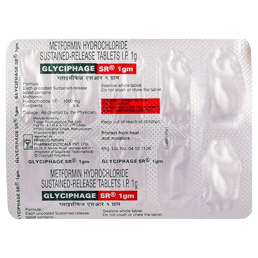 Glyciphage SR 1gm Tablet is a medicine used to manage type 2 diabetes by helping control high blood sugar levels. It works by improving the body’s response to insulin and reducing glucose production in the liver. When combined with a healthy diet and regular exercise, it helps lower the risk of diabetes-related complications, including kidney, nerve, or heart problems.