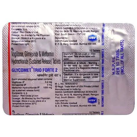 Glycomet Trio Forte 2 Tablet SR is a comprehensive oral medication for type 2 diabetes mellitus in adults. Combining Glimepiride, Metformin, and Voglibose, it works on multiple pathways to help regulate blood sugar levels, providing better glycemic control when single or dual therapies are insufficient. Regular use helps reduce the risk of long-term diabetes complications including kidney disease, neuropathy, eye damage, and cardiovascular issues.