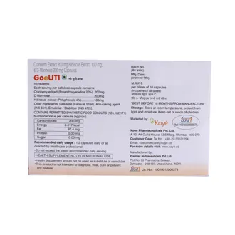 GoeUTI Capsule is a health supplement formulated with Cranberry Extract, D-Mannose, and Hibiscus Extract as its main components. It supports urinary tract health and is helpful in conditions such as urinary tract infections (UTIs), burning or painful urination, urinary incontinence, and discomfort caused by the presence of harmful bacteria like E. coli in the urinary system. By preventing the bacteria from sticking to the urinary tract lining, this capsule helps stop the spread of infection and lowers the risk of recurring urinary problems. It is especially beneficial for managing repeated episodes of cystitis, pyelonephritis, and recurrent UTIs, including those seen in diabetic individuals, women around menopause, and adolescents.