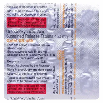Golbi SR 450 Tablet is a medicine used to help dissolve certain types of gallstones and prevent new ones from forming. It works by breaking down cholesterol, which is a major component of gallstones. This medication is also prescribed to manage a liver condition known as primary biliary cirrhosis, where it helps improve liver health.