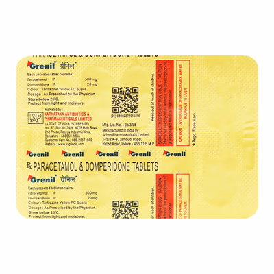 Grenil Tablet combines Domperidone and Paracetamol to provide effective migraine relief. Domperidone reduces nausea and vomiting by acting on the part of the brain that controls vomiting and improving gastrointestinal movement. Paracetamol acts as a pain reliever and fever reducer, blocking chemical messengers that cause headache and discomfort. Together, these actions help reduce the frequency and intensity of migraine attacks, improving daily functioning and overall quality of life.
