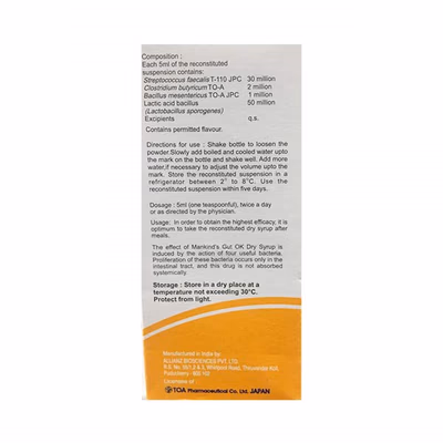 GUT OK Dry Syrup is a probiotic formulation designed to maintain a healthy balance of gut microflora and support overall digestive health. It is commonly used for managing diarrhea, indigestion, constipation, and other digestive problems. The syrup contains multiple probiotic strains that work synergistically to restore gut flora and promote smooth gastrointestinal function.