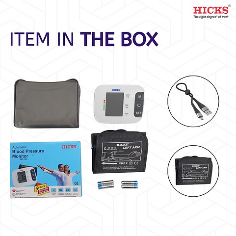 The Hicks Automatic BP Monitor Machine 850 is designed for accurate, reliable, and user-friendly blood pressure monitoring at home. With features such as dual user mode, 120-memory storage, irregular heartbeat detection, and WHO indicator compliance, it provides a complete health tracking solution for individuals and families. The universal arm cuff ensures a comfortable fit for all users, while the compact, lightweight design makes it convenient to use and store.