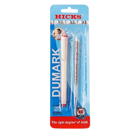 The Hicks Dumark Thermometer is a reliable and accurate glass thermometer designed for easy and consistent temperature measurement. Featuring imported white capillary tubing, it ensures precise readings within a clear range. Compactly packed in a blister pack for hygiene and protection, this thermometer is suitable for home or professional use. Its durable build makes it a trusted choice for everyday health monitoring.