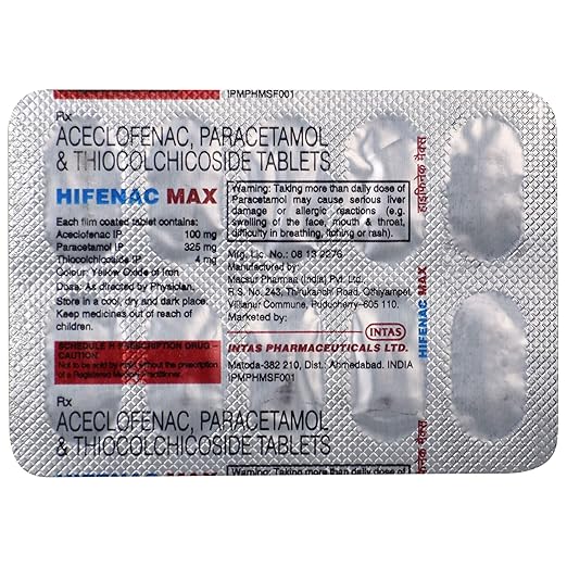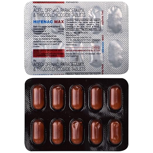 Hifenac Max Tablet combines the muscle relaxant Thiocolchicoside with the pain relievers Aceclofenac and Paracetamol, offering complete relief from pain and muscle stiffness. It helps restore mobility, allowing you to perform daily tasks with ease. By addressing both pain and inflammation, it provides comfort and improves overall physical function, supporting a more active lifestyle.