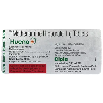 Huena Tablet is an antiseptic medication used to prevent urinary tract infections (UTIs). It works by converting into formaldehyde in acidic urine, which helps eliminate harmful bacteria and keeps the urinary tract clear of infection-causing microbes.