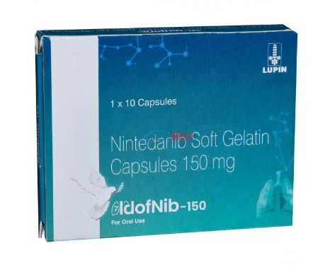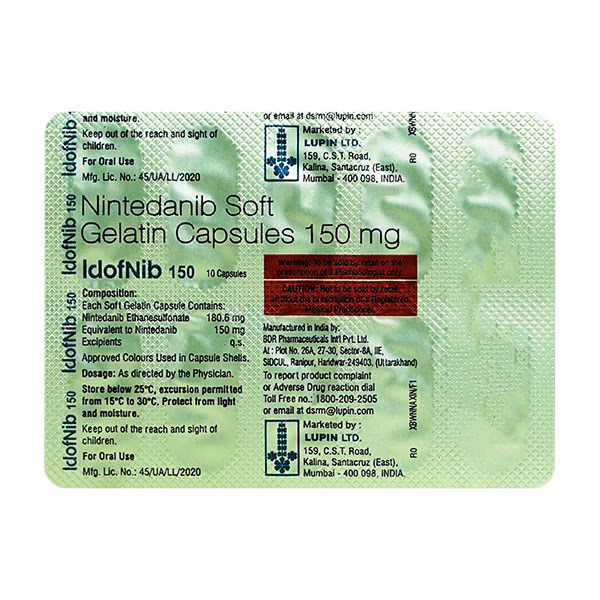 Idofnib 150 Soft Gelatin Capsule is a prescription medication designed to manage idiopathic pulmonary fibrosis (IPF) and non-small cell lung cancer (NSCLC). It works by targeting specific cellular pathways involved in the progression of these conditions, helping to slow disease advancement and prevent the proliferation of abnormal cells.
