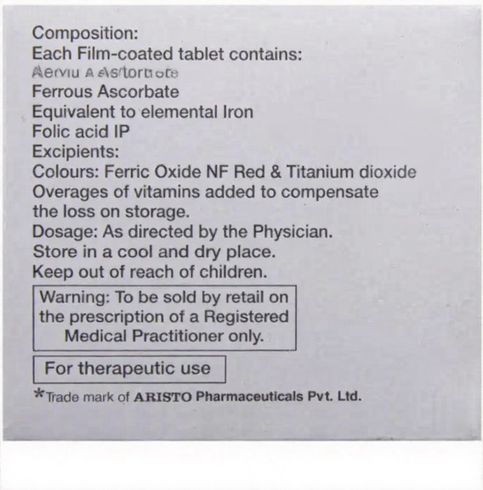 The tablet combines ferrous ascorbate (a form of iron) and folic acid (a B-vitamin essential for red blood cell formation). Ferrous ascorbate assists in transporting oxygen throughout the body and supports various cellular functions, while folic acid promotes healthy blood cell production and helps prevent anemia.