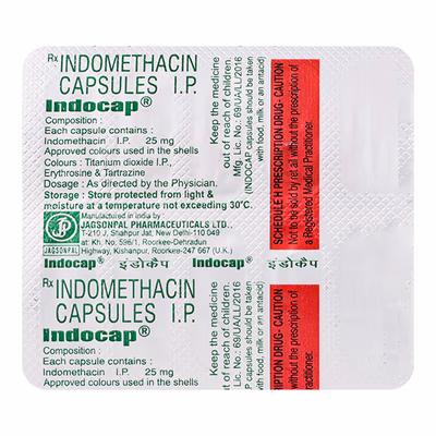 Indocap 25mg Capsule contains Indomethacin, a medicine classified under Non-Steroidal Anti-Inflammatory Drugs (NSAIDs). It is primarily used to decrease swelling and manage moderate to severe joint-related inflammatory conditions such as rheumatoid arthritis, osteoarthritis, and degenerative hip disorders. It also helps relieve pain and stiffness in the spine caused by ankylosing spondylitis.