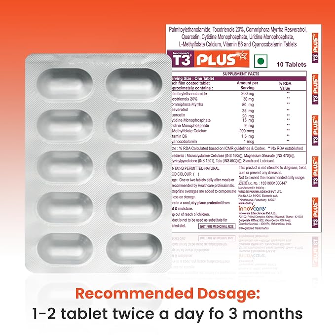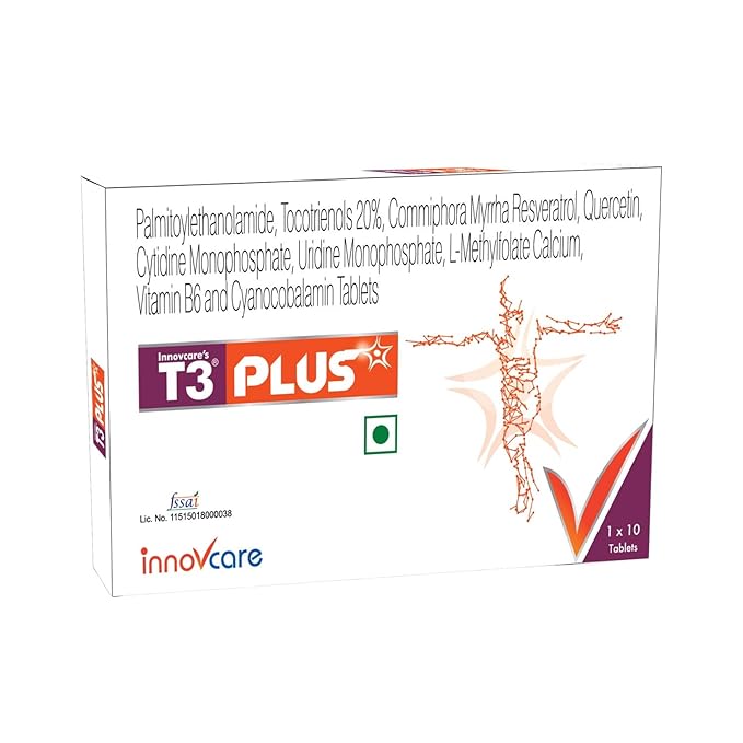T3 Plus Tablet by Innovcare is a specialized supplement designed to promote nerve health, support cognitive function, and manage discomfort associated with nerve inflammation. Its unique formulation combines natural anti-inflammatory agents, antioxidants, and neuro-nutrients to provide comprehensive nerve care. T3 Plus Tablet may help reduce nerve-related pain, support nerve cell repair, and enhance overall neurological well-being.