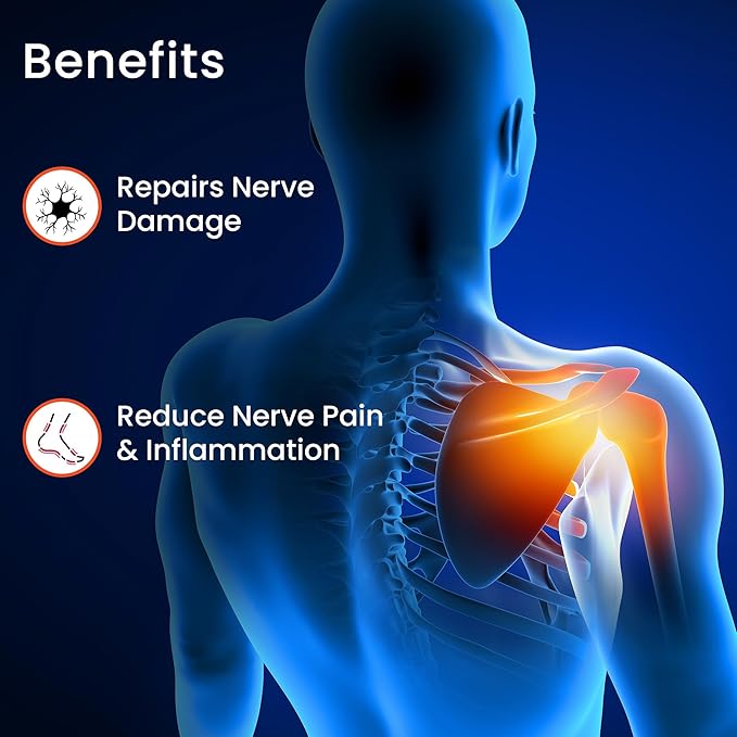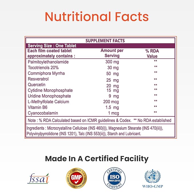 Tocotrienol 20% 30 mg, Resveratrol 25 mg, Quercetin 20 mg: Potent antioxidants that protect nerve cells from oxidative stress, supporting long-term nerve health.