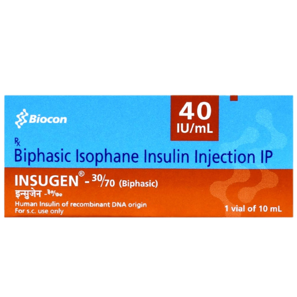 Insugen 30/70 Solution for Injection 40IU/ml is an insulin used to manage blood sugar levels in people with type 1 and type 2 diabetes. It combines rapid-acting and intermediate-acting insulin to provide both quick and long-lasting glucose control throughout the day.