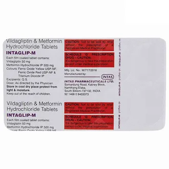 Your doctor may prescribe Intaglip-M Tablet alone or alongside other diabetes medicines. For the best results, it should be taken along with a proper diet and regular physical activity. The exact dose will depend on your current health condition, blood sugar readings, and other medications you may be taking. It is best taken with meals to minimize stomach discomfort. Taking it at the same time every day helps maintain steady blood sugar levels. Do not stop taking the medicine unless advised by your doctor. Along with the medication, following a healthy lifestyle and exercise routine is vital to achieve better diabetes control.