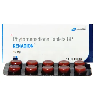 Kenadion Tablet contains Vitamin K1 (Phytomenadione) as its main active ingredient. It is a vitamin supplement that helps in the formation of blood clotting factors, preventing and treating bleeding disorders caused by Vitamin K deficiency. It supports normal clotting function and maintains overall circulatory health.