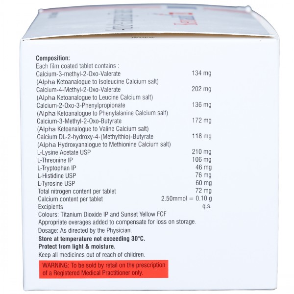 Ketoadd DS Tablet contains essential amino acids that follow the same metabolic pathways as natural amino acids. It helps the body use dietary proteins more efficiently, minimizes the formation of harmful nitrogen waste, and improves kidney function by reducing the load on the kidneys.