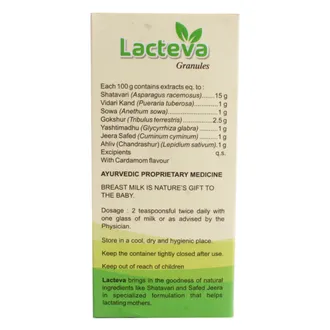 Lacteva Granules is a specially formulated nutritional supplement designed to support lactating mothers and improve breast milk production. It provides essential vitamins, minerals, and natural nutrients that help promote healthy milk secretion, enhance maternal energy, and support overall well-being during the breastfeeding period. Regular use under medical guidance helps meet the increased nutritional demands of lactation, reduces fatigue, and contributes to both maternal and infant health. The granules are easy to dissolve in water or milk, ensuring convenient consumption and faster absorption of nutrients. By improving nutrient availability, Lacteva Granules supports a healthy immune system, strengthens the mother’s body, and provides vital nourishment to the infant. When combined with a balanced diet and adequate hydration, Lacteva Granules helps mothers maintain energy levels, recover from childbirth, and promote optimal growth and development of their babies.