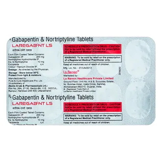 Laregab NT LS Tablet is a combination medicine containing Gabapentin (200 mg) and Nortriptyline (10 mg). It is primarily used for the management of neuropathic pain, which is pain caused by nerve damage from conditions like diabetes, shingles, or spinal cord injury.