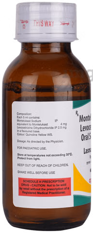 The syrup contains Levocetirizine, an antihistamine that reduces symptoms like runny nose, watery eyes, and sneezing, and Montelukast, which blocks leukotrienes responsible for airway swelling and inflammation. Together, they provide relief from allergic symptoms and improve breathing.