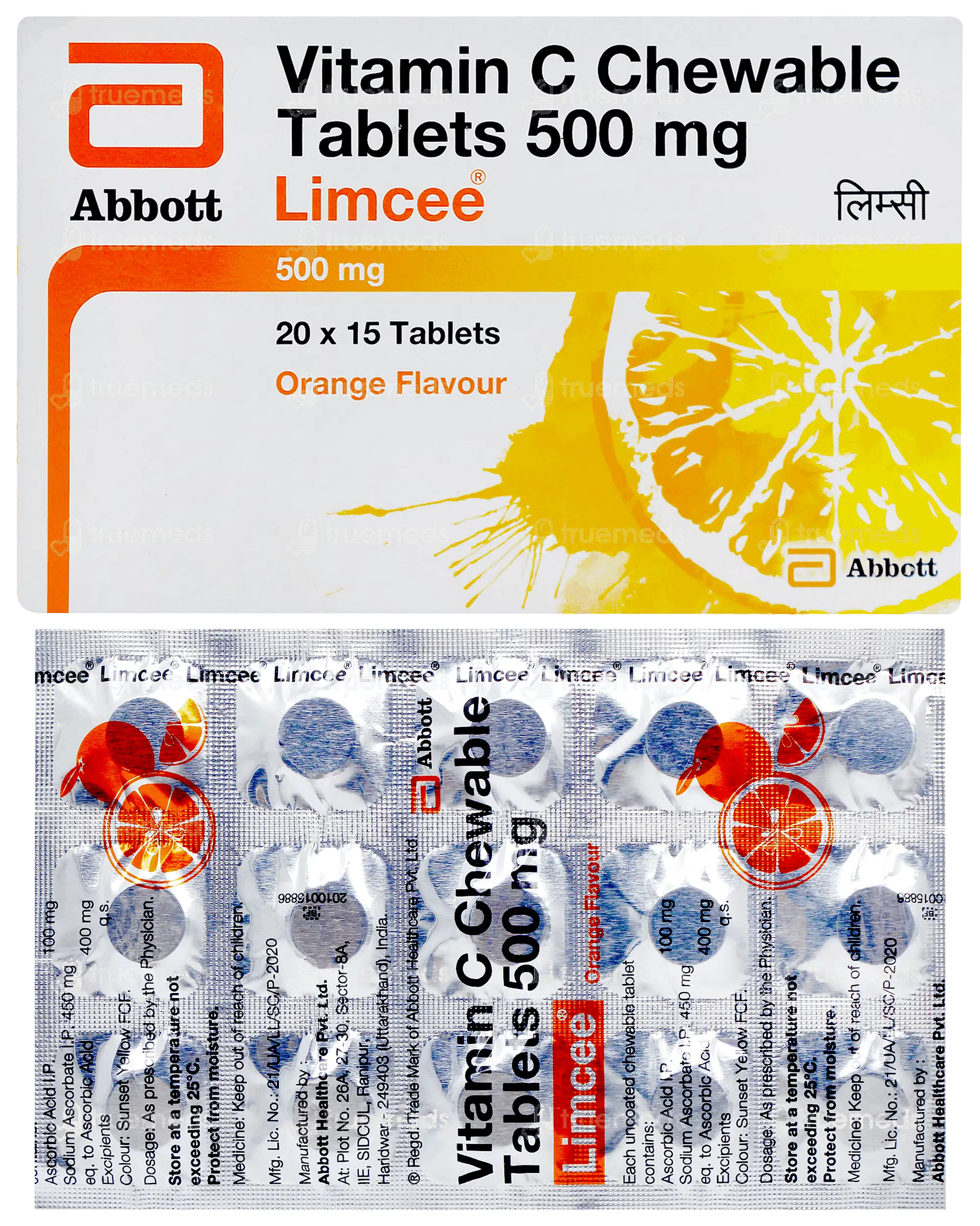 Limcee Chewable Tablet is a dietary supplement formulated with Vitamin C (ascorbic acid), designed to support overall health and wellness. It is particularly beneficial for individuals with low levels of vitamin C due to dietary insufficiency or increased physiological demand. Known for its antioxidant properties, vitamin C helps promote the health of skin, teeth, bones, and blood vessels, while also contributing to immune defense and cellular protection against oxidative stress.
