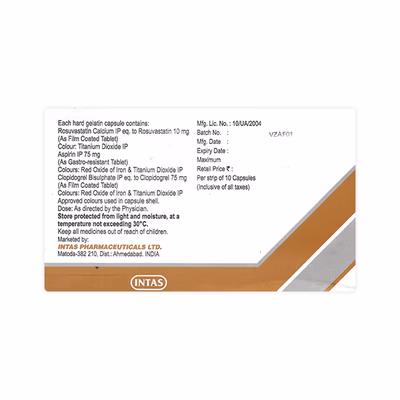 This capsule combines three medicines. Rosuvastatin lowers cholesterol levels by blocking the production of cholesterol in the body. Aspirin and Clopidogrel prevent blood cells from clumping together, which helps keep blood flowing smoothly and prevents clots that can block blood vessels.
