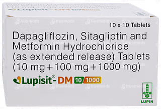 Lupisit DM 10mg/1000mg/100mg Tablet ER is a triple-combination medicine containing Dapagliflozin (10mg), Metformin Extended Release (1000mg), and Sitagliptin (100mg). It is prescribed for people with type 2 diabetes mellitus when blood sugar control cannot be achieved with single or dual medicines. The extended release form of Metformin provides a slow and steady effect, improving tolerance and long-lasting sugar control.