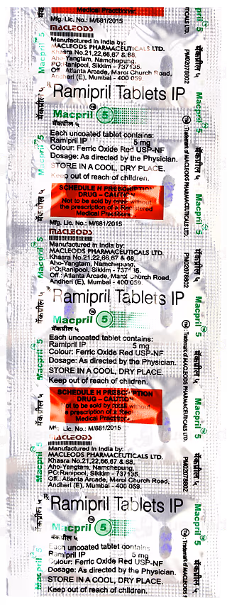 Macpril 5 Tablet is a prescription medicine that belongs to the group of angiotensin converting enzyme inhibitors, widely used for the management of high blood pressure and heart-related disorders. By relaxing blood vessels and reducing strain on the heart, it helps maintain smooth blood flow and prevents complications associated with uncontrolled hypertension. Doctors also prescribe it to improve survival after a recent heart attack, manage chronic heart failure, and protect kidney function in certain patients, especially those with diabetes. Regular use of Macpril 5 Tablet helps in lowering the risk of heart attack, stroke, and kidney damage. It should always be taken under medical supervision, and patients must continue therapy even if they feel well, as stopping suddenly may worsen the condition. Along with medication, lifestyle modifications such as a healthy diet, exercise, and reduced salt intake further enhance its benefits and ensure long-term cardiovascular health.