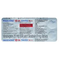 Maxvoid M 25mg/8mg Tablet combines two active ingredients: mirabegron and silodosin. Mirabegron helps relax the bladder muscles, reducing urgency and frequency of urination. Silodosin works by relaxing muscles around the bladder and prostate, easing urine flow.