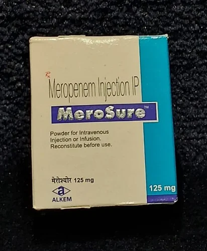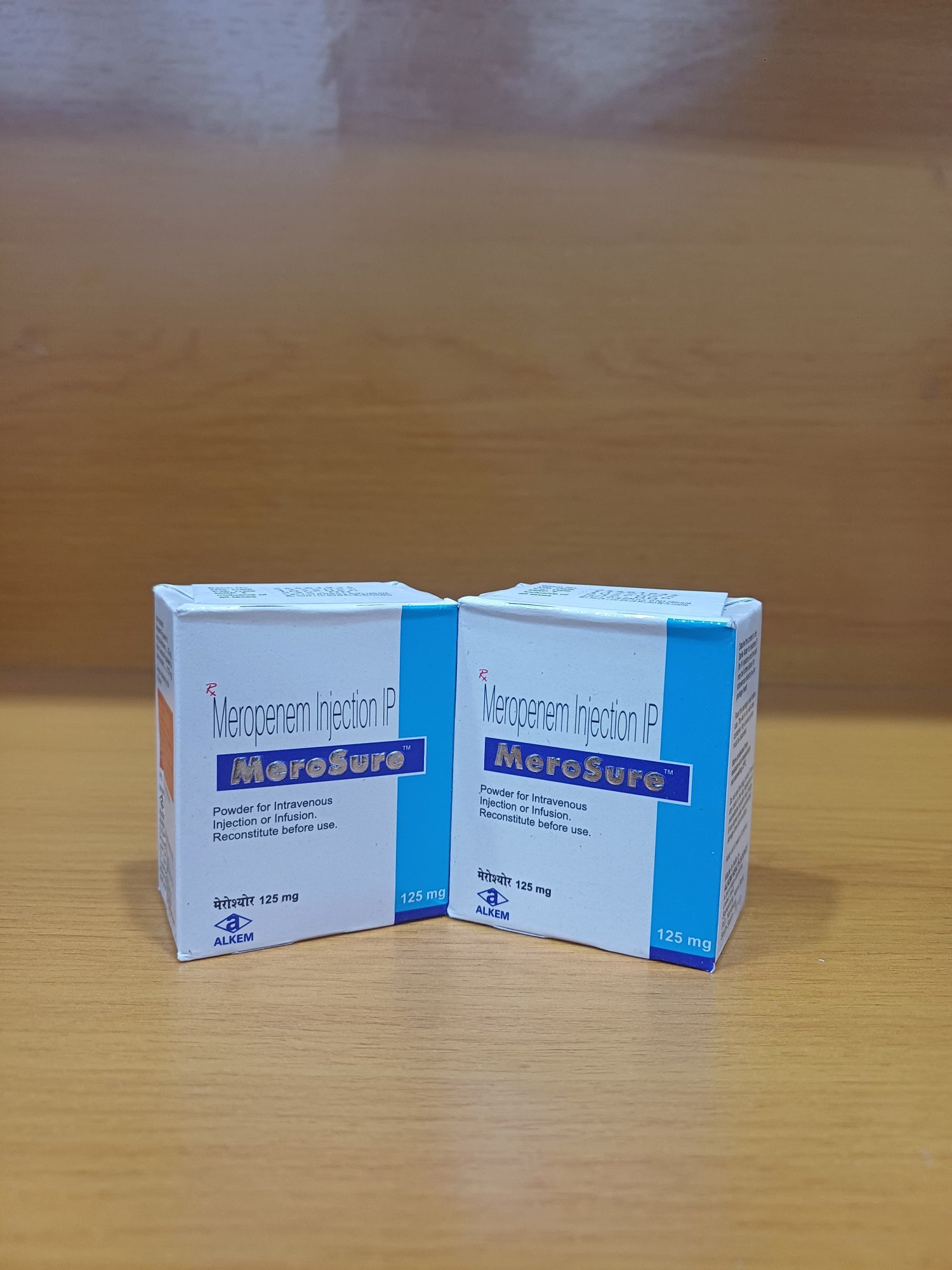 Merosure 125 mg Injection Kit is an antibiotic used to manage severe bacterial infections affecting the lungs, brain, urinary tract, skin, soft tissues, and bloodstream. It contains Meropenem, a broad-spectrum carbapenem antibiotic that works by destroying bacterial cell walls, effectively killing the bacteria responsible for the infection.