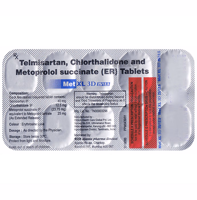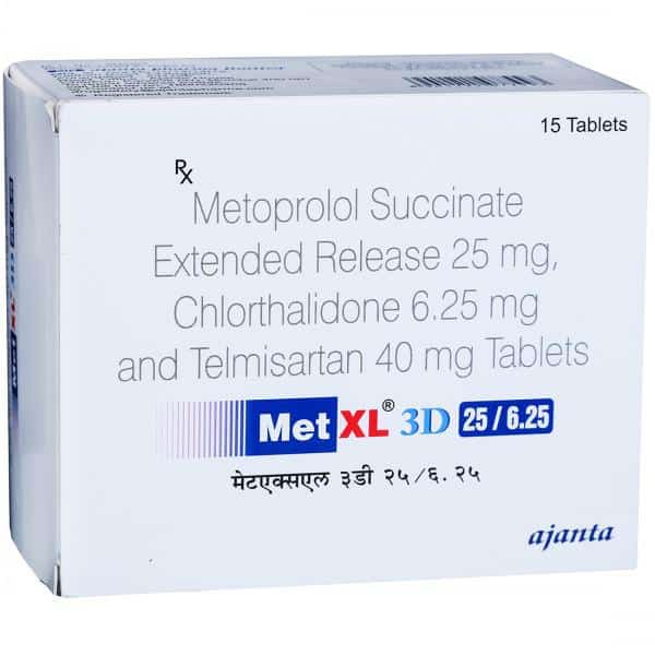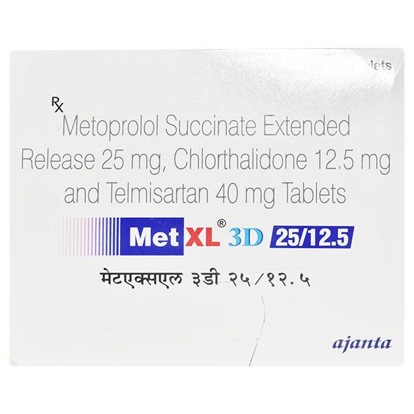 Met XL 3D 25/12.5 Tablet is a combination medication designed to manage high blood pressure (hypertension). It works by helping the heart pump blood more efficiently, relaxing blood vessels, and promoting the removal of excess fluids and salts from the body. This helps reduce the strain on the heart and supports healthy circulation. The tablet can be taken with or without food, but it should be consumed at the same time daily for consistent results. Since it promotes urination, it is best taken earlier in the day to prevent nighttime trips to the bathroom. Always follow your doctor’s instructions on dosage and duration. The treatment plan will vary depending on your medical condition and response to therapy. Common side effects may include stomach discomfort, nausea, diarrhea, dizziness, headache, and a drop in blood pressure. Cold hands or feet and a slowed heart rate may also occur. Your doctor may recommend regular monitoring of kidney function and electrolyte levels to ensure safety. This medicine works best when paired with lifestyle modifications such as a balanced diet, regular physical activity, and avoiding smoking. Be sure to stay well-hydrated, especially if you experience dry mouth or increased thirst. Before starting treatment, inform your doctor if you are pregnant, planning to become pregnant, or breastfeeding. Also disclose any history of kidney, liver, or circulatory problems, as well as any other medications you are taking to avoid potential interactions. This medicine is not recommended for individuals with severe liver or kidney disorders. Alcohol consumption should be avoided as it may amplify certain side effects like dizziness. The active ingredients in Met XL 3D 25/12.5 include chlorthalidone, a diuretic that removes excess fluid and salts; metoprolol succinate, a beta-blocker that lowers heart rate; and telmisartan, which helps relax blood vessels by blocking angiotensin receptors. Together, they help in effectively managing blood pressure and reducing the risk of complications such as heart attacks, strokes, or kidney damage. If you miss a dose, take it as soon as you remember. If it’s nearly time for the next dose, skip the missed one and continue with your regular schedule. Never take a double dose to make up for the missed one.