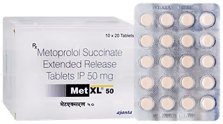 Met XL 50 Tablet is primarily indicated for managing hypertension, angina, arrhythmia, and preventing migraines, strokes, and heart attacks. It belongs to the class of extended-release beta-blockers that help control blood pressure by blocking the action of certain chemicals on the heart and blood vessels. This action slows the heart rate and reduces the force of heart contractions, leading to lower blood pressure. By improving heart efficiency and reducing vascular resistance, it lowers the long-term risk of serious complications such as kidney failure, heart failure, and cerebrovascular events. Continued use is important even if symptoms subside. Side effects usually resolve on their own, but medical advice should be taken if they persist. Typical adverse reactions include dizziness, tiredness, breathlessness, nausea, headache, slow heart rate, low blood pressure, diarrhea, rash, and mood changes.