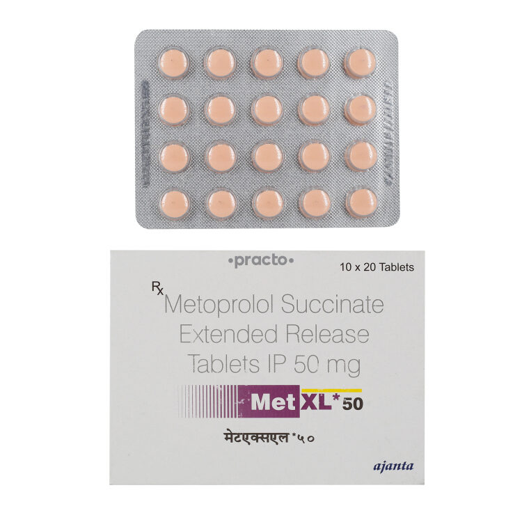 Met XL 50 Tablet is a medication from the beta-blocker class, prescribed for managing conditions such as high blood pressure, chest pain related to the heart (angina), and irregular heartbeat (arrhythmia). It is also effective in reducing the chances of future cardiovascular events like heart attacks or strokes, and it can help in preventing migraines. This medicine is often used alone or in combination with other drugs depending on the patient’s specific health condition and severity. The dosage and duration are determined by the doctor. It can be taken with or without meals, but should be taken consistently at the same time each day for maximum effectiveness. It may take a few weeks to experience its full benefits, and in many cases, it needs to be taken indefinitely. Even if symptoms improve, do not discontinue the medicine without consulting your doctor, as high blood pressure often presents without noticeable symptoms and stopping abruptly may worsen your condition. Common side effects include fatigue, dizziness, headache, low heart rate, diarrhea, nausea, rash, and mild depressive symptoms. Some individuals may also experience breathing difficulty or reduced blood pressure. To minimize the chance of adverse effects, doctors usually initiate treatment with a low dose and gradually increase it as needed. If any side effects become persistent or bothersome, medical advice should be sought. Inform your doctor in advance if you have liver issues or any conditions related to poor blood circulation, slow heartbeat, severe heart failure, or hypotension. Pregnant and breastfeeding women should only use this medicine under strict medical supervision. Regular monitoring of blood pressure is necessary to assess the drug’s effectiveness. Alcohol should be avoided during treatment, as it can enhance the side effects of the medication.