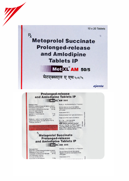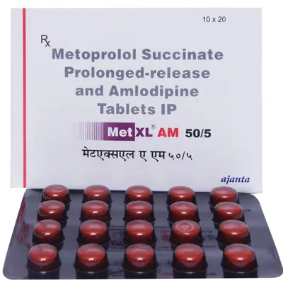 Met XL AM 50/5 Tablet is a combination medication designed to help manage high blood pressure and regulate heart rhythm effectively. It is also beneficial in treating chest discomfort caused by angina, irregular heartbeats, and long-standing heart failure. The two active ingredients in this tablet work together to reduce the strain on the heart by slowing down the heart rate and relaxing blood vessels, which improves blood flow and lowers blood pressure. This helps in minimizing the risk of serious cardiovascular complications such as heart attacks, strokes, or kidney issues. The medicine should be taken once daily, ideally at the same time each day, with or without food. It is essential to continue the treatment as prescribed, even if you feel perfectly fine, since high blood pressure usually presents no visible symptoms. Stopping the medication suddenly without medical advice can lead to worsening of the condition. For best results, it’s recommended to pair the treatment with healthy lifestyle practices, such as maintaining a balanced diet, engaging in regular physical activity, and managing body weight. Some users may experience side effects like dizziness, headache, fatigue, swelling of the ankles, slow heartbeat, skin irritation, nausea, or mood changes. If dizziness or drowsiness occurs, it is advised to avoid driving or operating machinery. The medicine might slightly raise potassium levels in the blood, so it’s better to limit intake of potassium-rich foods and supplements unless otherwise directed by your healthcare provider. Regular check-ups to monitor blood pressure, kidney function, and electrolyte balance may be advised during the course of treatment. Before beginning the medication, inform your doctor if you have any liver or kidney-related concerns. It is also important to mention if you’re pregnant, planning to conceive, or breastfeeding, as the medicine may not be suitable in such cases without medical supervision. You should also provide your doctor with a full list of medications you’re currently taking to avoid potential interactions. While Met XL AM 50/5 Tablet is generally well tolerated, possible side effects may include nausea, constipation, visual disturbances, vomiting, abdominal discomfort, breathlessness, flushing, muscle cramps, palpitations, orthostatic hypotension, excessive sleepiness, or mild skin rash. These effects are typically temporary and go away as your body adjusts to the medication. If any symptoms persist or cause concern, consult your doctor promptly. In case you forget to take a dose, take it as soon as you remember, unless it is close to your next scheduled dose. Do not double the dose to compensate for the missed one.