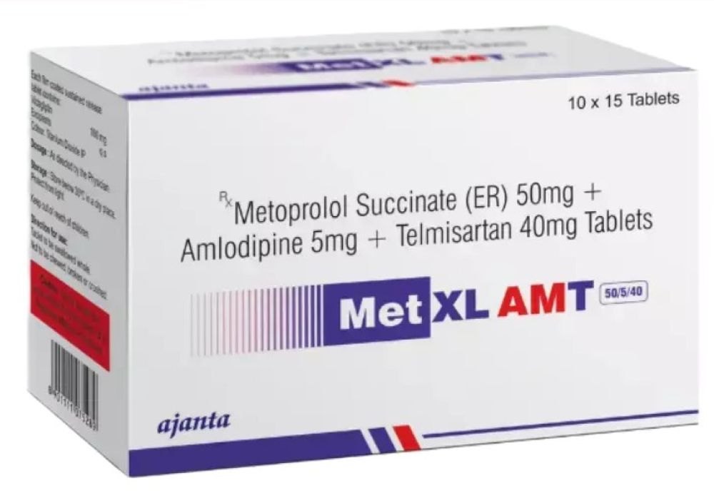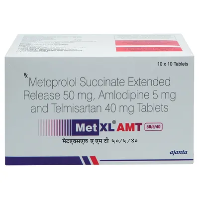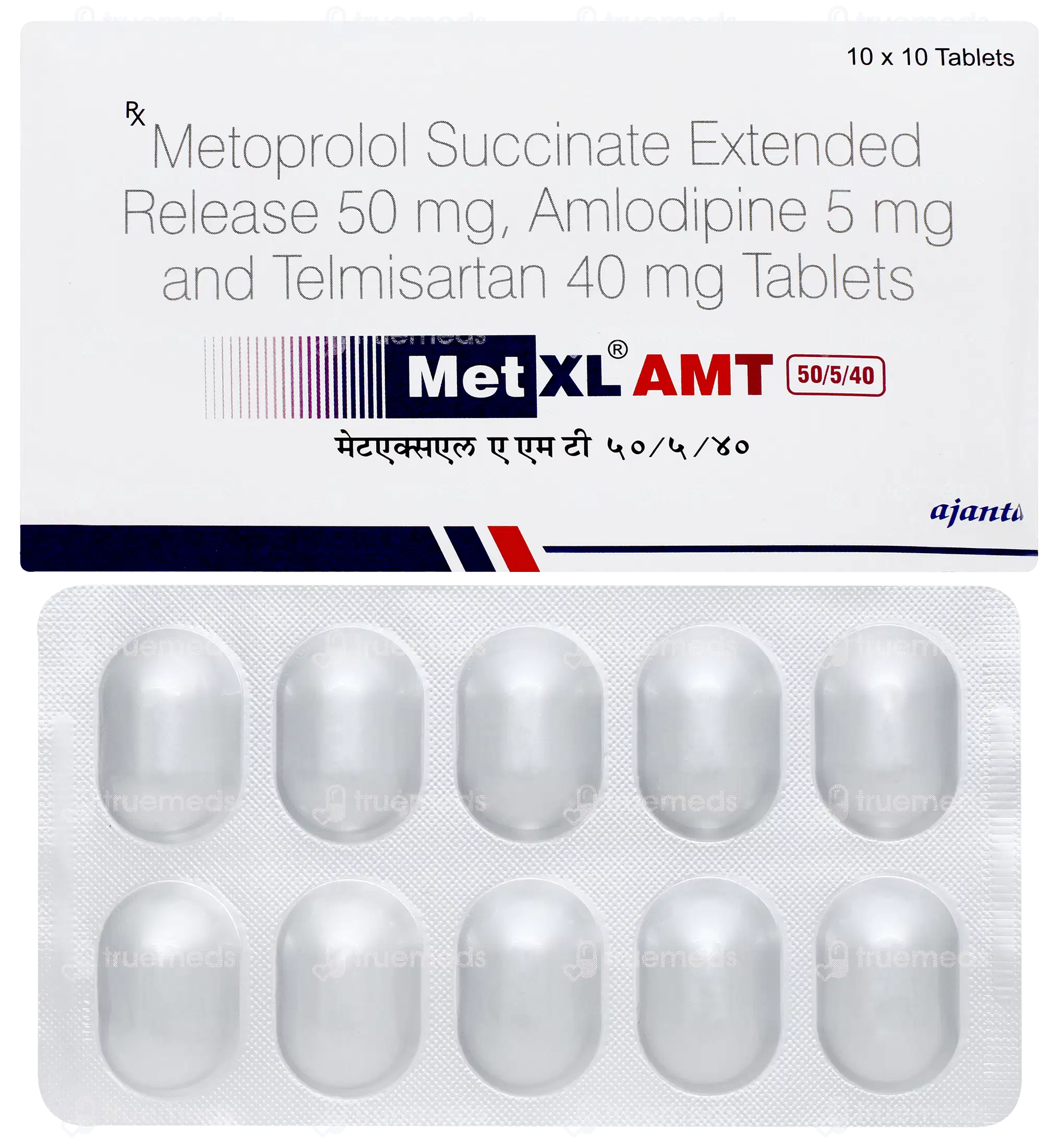Met XL AMT 50/5/40 Tablet ER is a triple-combination medication used to manage high blood pressure and related heart conditions. It works by easing the tension in blood vessels and improving how efficiently the heart pumps blood throughout the body. This not only reduces blood pressure but also helps lower the risk of serious complications such as stroke, heart attack, or kidney damage. The tablet can be taken at any time during the day, with or without food, but it’s best to take it consistently at the same hour each day. Even if you begin to feel better, you should continue the medication as prescribed, since high blood pressure often presents no obvious symptoms and stopping treatment abruptly may worsen your condition. Leading a healthy lifestyle that includes regular exercise, a balanced diet, and weight control will further enhance the benefits of this medicine. Some commonly reported side effects include throat infections, sinus issues, back pain, and digestive discomfort like diarrhea. It might also cause dizziness or drowsiness in some individuals, so you should avoid driving or performing tasks that need focus until you understand how your body responds to the treatment. The medicine may affect potassium levels in your blood, so it’s advisable to avoid potassium-rich foods or supplements unless advised otherwise by your doctor. Regular monitoring of your blood pressure, kidney function, and electrolyte levels may be recommended during the course of treatment. Before starting this medication, inform your doctor if you have any liver or kidney-related health issues. It may not be suitable for use during pregnancy or breastfeeding unless clearly approved by a healthcare professional, as it could potentially affect the baby. Make sure to share a list of any other medications you’re taking, especially those related to heart disease or blood pressure, to avoid interactions. This medicine contains three active ingredients that work together to reduce blood pressure in different ways—Metoprolol lowers heart rate, Amlodipine relaxes arterial walls, and Telmisartan prevents blood vessel constriction. These combined effects help maintain stable blood pressure and improve overall heart function. In case you forget a dose, take it when you remember unless it’s nearly time for your next scheduled dose. Do not take a double dose to make up for a missed one.