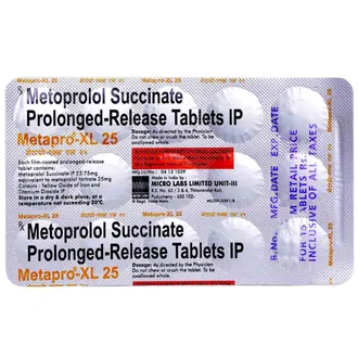 Metapro-XL 25 Tablet is a medication classified under beta-blockers. It is primarily used to manage high blood pressure, chest pain caused by heart-related issues (angina), and irregular heartbeat (arrhythmia). This medicine is also prescribed to prevent migraines, future strokes, and heart attacks.