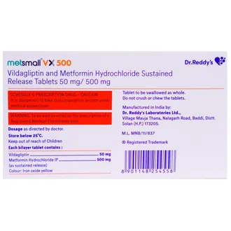 Metsmall VX 500 Tablet SR is a medication designed to manage high blood sugar in adults with type 2 diabetes. By keeping blood sugar under control, it helps reduce the risk of serious health complications, including kidney problems, vision damage, and cardiovascular issues such as heart attack or stroke.